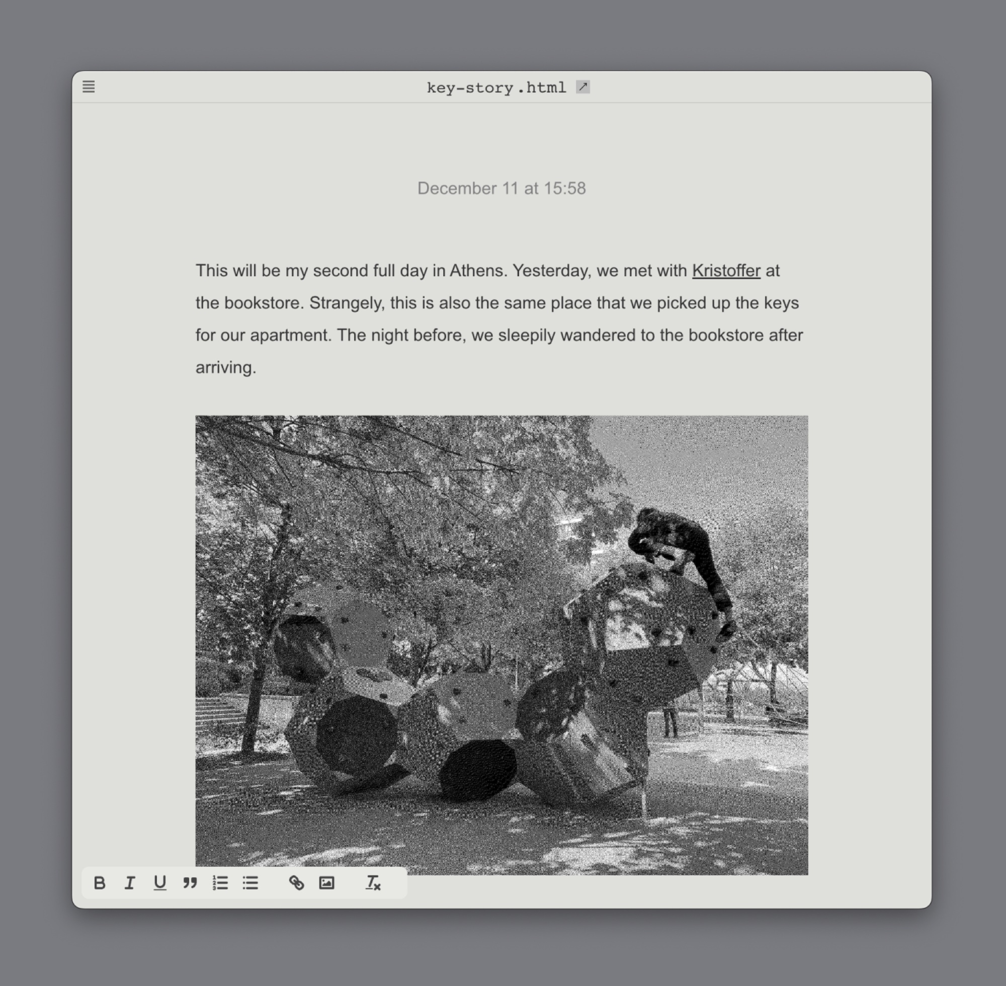 I've continued traveling, collecting files that people want to let go of intentionally. This project has taught me a lot about being light, both in how I move and in my mindset. The entire website consists of just one page, using dithered and compressed images, and it's downloadable. I've been trying to approach it conceptually with a lighter feeling. When I'm traveling, I mention the project when appropriate but don't actively seek out transfers. It's nice when they happen by chance.